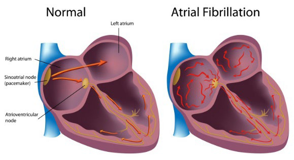 The upper heart chambers (atria) beat in a disorganized way and cause irregular heartbeats. This causes blood to pool, so a clot may form. If these clots break loose, they may travel to the brain and cause a stroke.